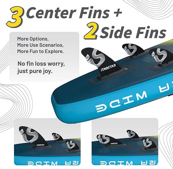 - More Fun - Exclusively from iTAOSTAR, our five tailored fins (3 central + 2 side fins) adapt to various scenrios, offering diverse balance and zero fin-loss worries. Dive into personalized paddleboarding fun without limits