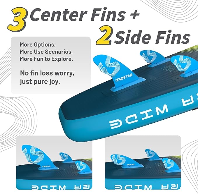 - More Fun - Exclusively from iTAOSTAR, our five tailored fins (3 central + 2 side fins) adapt to various scenrios, offering diverse balance and zero fin-loss worries. Dive into personalized paddleboarding fun without limits