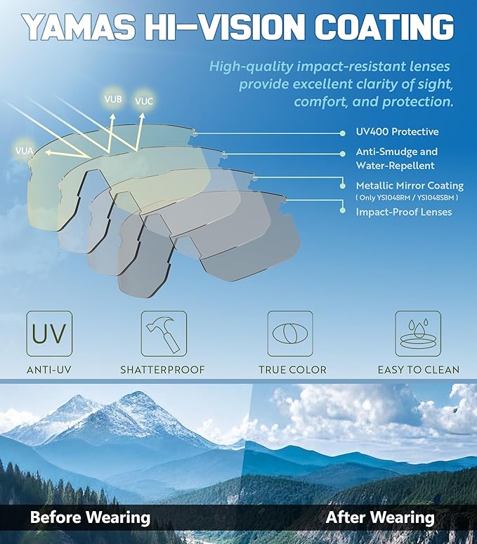 - UV400 Protection: Shield your eyes with YAMAS YS1048S Sport sunglasses. Enjoy safe, comfortable vision in the sun with these protective lenses, safeguarding your eyes from sun damage.