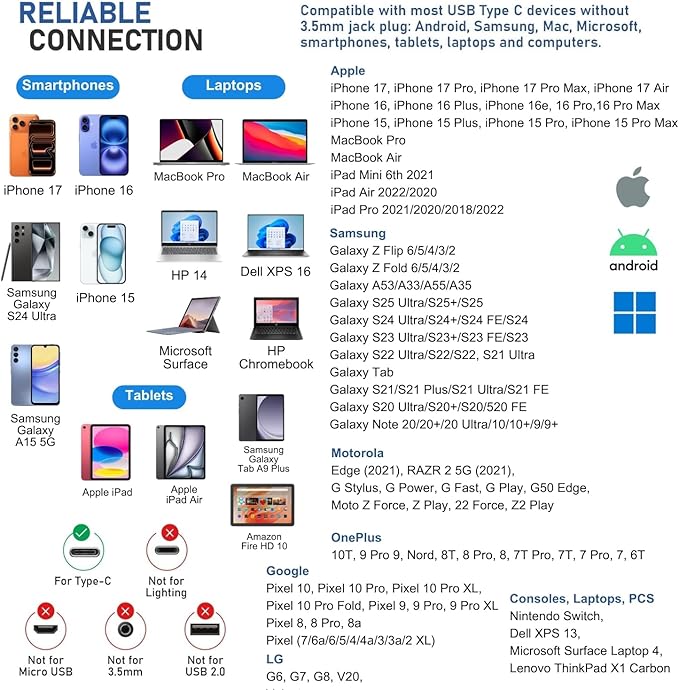 - SAMSUNG: Galaxy S24/S23/S22/S21/S21+/S21 Ultra/S21/S21 Ultra/S21 FE/S20/ Galaxy Tab S8/S7/S6/S5e, A53/A54/A55/A33/A34/A35 Galaxy Z Flip 6/5/4/3/2 Fold 6/5/4/3/2 - GOOGLE Pixel 10/Pro/XL/Fold, Pixel 9/Pro/XL, 8/Pro/8a, 7/6a/6 PRO/6/5/4/4a — MOTOROLA Edge 2021 — LAPTOPS: DELL XPS 13, MICROSOFT Surface Laptop 4. And more devices without a 3.5mm jack port. We provide a 5-year warranty and our customer support is here to answer questions 24/7