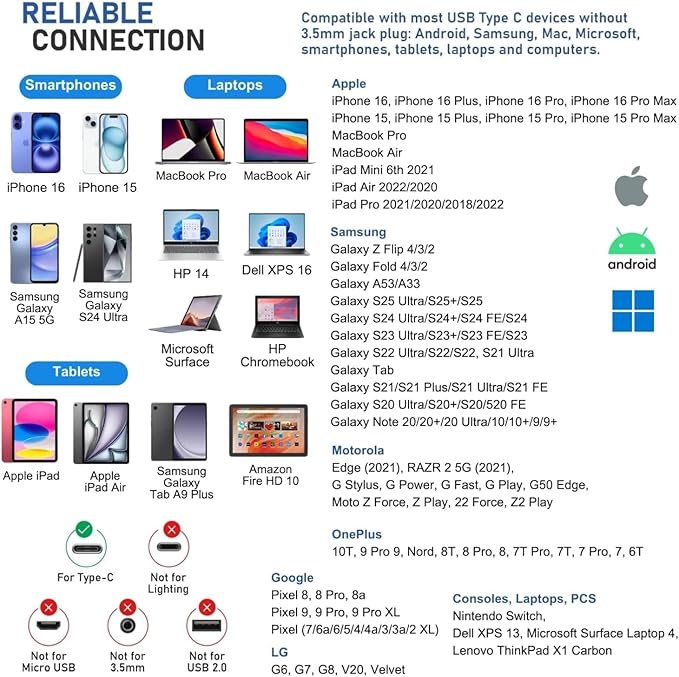 - SAMSUNG: Galaxy S24/S23/S22/S21/S21+/S21 Ultra/S21/S21 Ultra/S21 FE/S20/ Galaxy Tab S8/S7/S6/S5e, A53/A54/A33/A34 - GOOGLE Pixel 7/6a/6 PRO/6/5/4/4a — MOTOROLA Edge 2021 — LAPTOPS: DELL XPS 13, MICROSOFT Surface Laptop 4. And more devices without a 3.5mm jack port. We provide a 5-year warranty and our customer support is here to answer questions 24/7