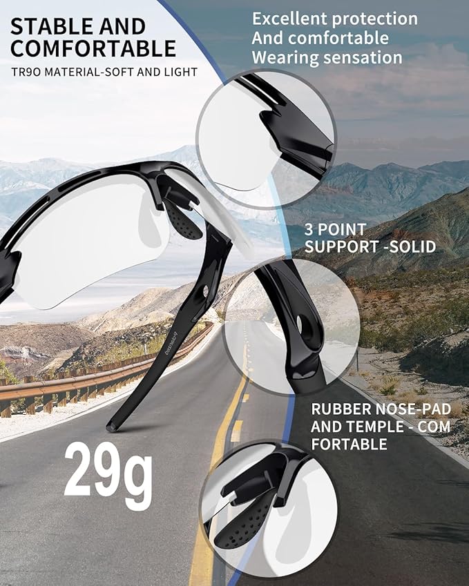 - [Ultra-Lightweight 28g & Anti-Fog Design]: The frame is made from super-lightweight, flexible, and durable TR90 material (only 28g – lighter than most sunglasses!). Lenses feature an anti-fog coating combined with side ventilation ports to prevent fogging during activity or temperature changes, maintaining clear vision.