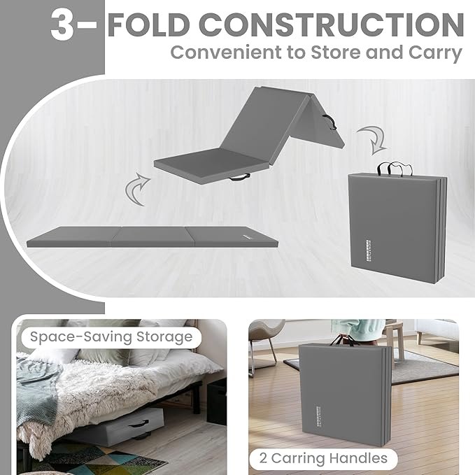 - Effortless Portability: Transform any space instantly! This exercise mat folds into a compact 24”x24”x6” size with 3-panel design and handles, making storage in closets, cars, or under beds a breeze. Unfold to a spacious 2’x6’ training area—ideal for yoga flows, Pilates routines, or group workouts