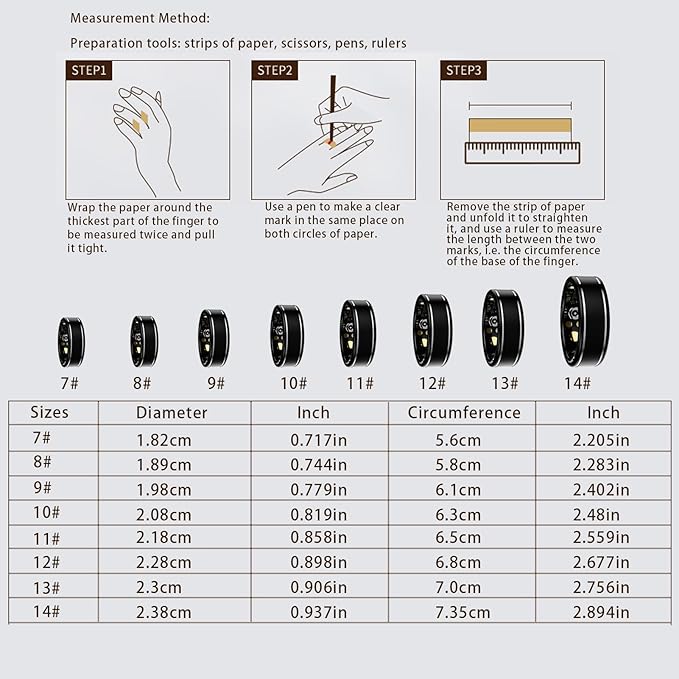 - 【Select the Right Size】: Before purchasing the Anarow smart health ring, please refer to our detailed size chart and measure your finger circumference to ensure the most accurate and comfortable fit. The health ring is available in 8 sizes, designed for all-day wear with a sleek, secure feel. If your measurement falls between sizes, we recommend choosing the larger size for better comfort and optimal sensor accuracy
