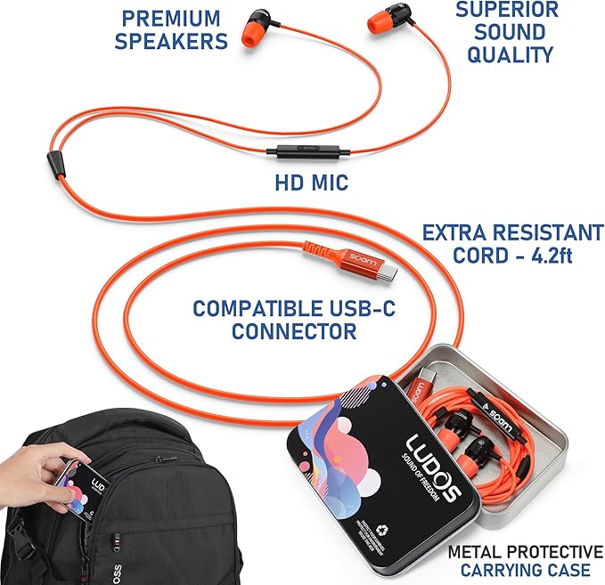 - BUILT FOR HOURS OF COMFORTABLE WEARING – These USB C headphone feature rock solid design and a extra long 4.2 ft cord; earphones wired with mics are designed to be super tough and withstand the most demanding conditions; When you need wired ear buds for performance, trust only LUDOS
