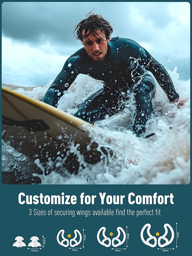- [CUSTOM FIT]: Comes with 3 sizes of securing wings S,M,L to fit all ears with different shapes and sizes. Keeps your swim ear plugs stays in place, for swimming, shower, bathing, water skiing, kayaking, canoeing, and other water sports