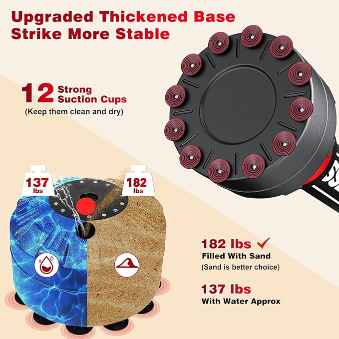 - Sturdy Base: The boxing bag is equipped with 12 strong detachable suction cups and a reinforced circular ABS base; Fill with water (137lb) or sand (182lb) for exceptional stability on various surfaces