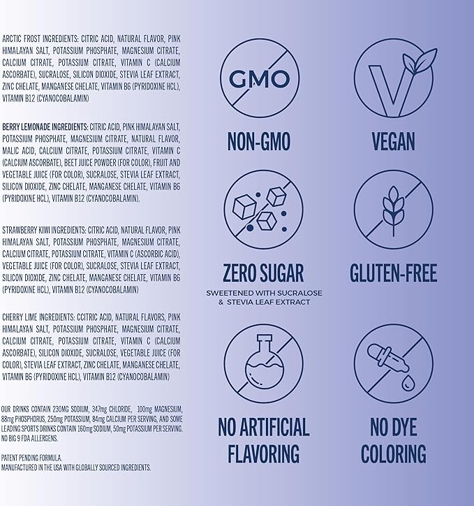 - All the Good Stuff and Zero Sugar: Each stick is filled with 3x electrolytes vs traditional sports drinks - Sodium, Potassium, Magnesium, Vitamin C, Pink Himalayan Salt - all while being Sugar Free, Non-GMO, Allergen Free, Vegan, with No Artificial Preservatives and No Artificial Coloring