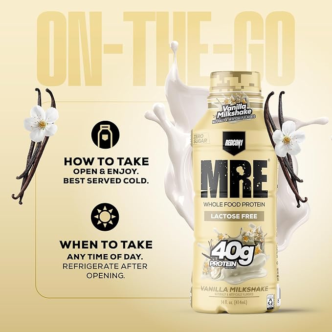 REDCON1 MRE Ready to Drink Protein Shake, Vanilla Milkshake - Lactose + Whey Free RTD 40gr Protein Made with Real Whole Food Protein Blends - Keto-Friendly, Easy to Digest Nutritional Shake (12 Pack)